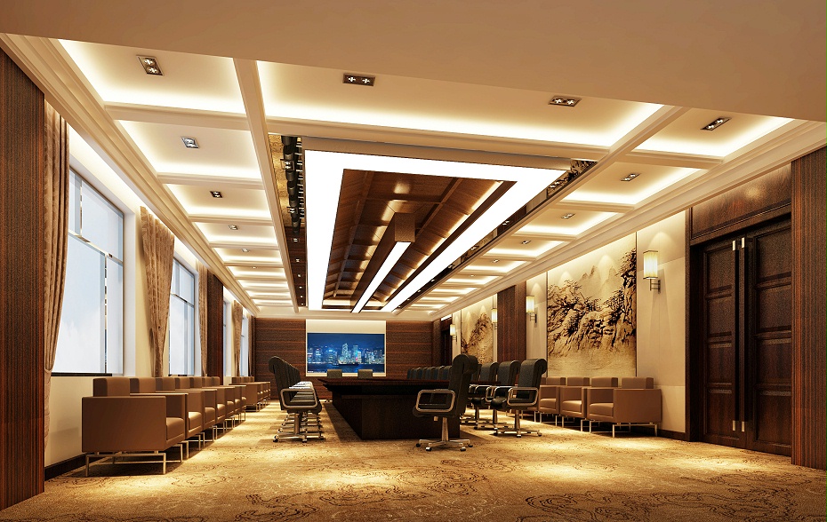 方方正正的的座椅穩(wěn)如泰山,是這個(gè)會(huì)議空間區(qū)別于其他空間的屬性。這樣的空間更加商業(yè)化。兩幅山水畫是這個(gè)空間的的特色,花紋的地毯并沒有擾亂這個(gè)空間的格調(diào),并且與之相合。