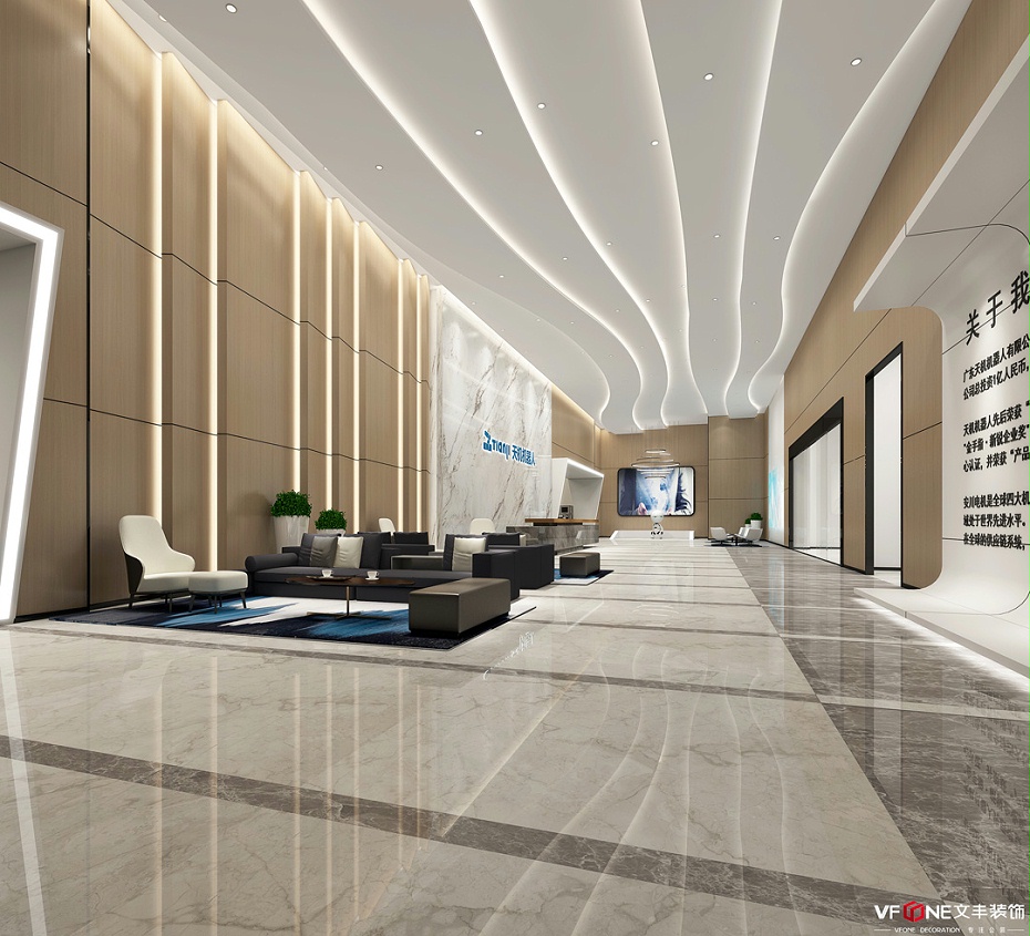 工業(yè)廠房裝修如何設(shè)計(jì): 前廳的設(shè)計(jì)簡(jiǎn)約流暢,如同波浪形的吊頂規(guī)則線條與原木造型的墻面,褐色紋理的大理石背景墻是前臺(tái)點(diǎn)睛之筆,使得整個(gè)前廳空間時(shí)尚動(dòng)感又不失內(nèi)涵,充滿了人文氣息。